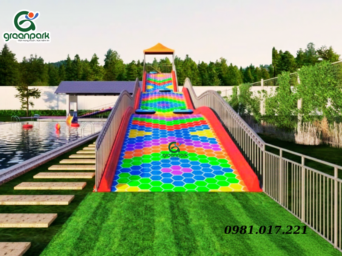 Cầu trượt cầu vồng – cầu trượt phao GP02002 là mẫu đường trượt cầu vồng gây ấn tượng mạnh nhờ thiết kế màu sắc đa lớp, phối màu rực rỡ và có chiều sâu thị giác. Toàn bộ bề mặt trượt được cấu tạo từ các mảng màu chuyển sắc liên tục như xanh lá – xanh dương – vàng – cam – đỏ – tím, sắp xếp theo dạng ô lục giác đều, tạo cảm giác chuyển động sinh động khi trẻ trượt xuống từ trên cao.