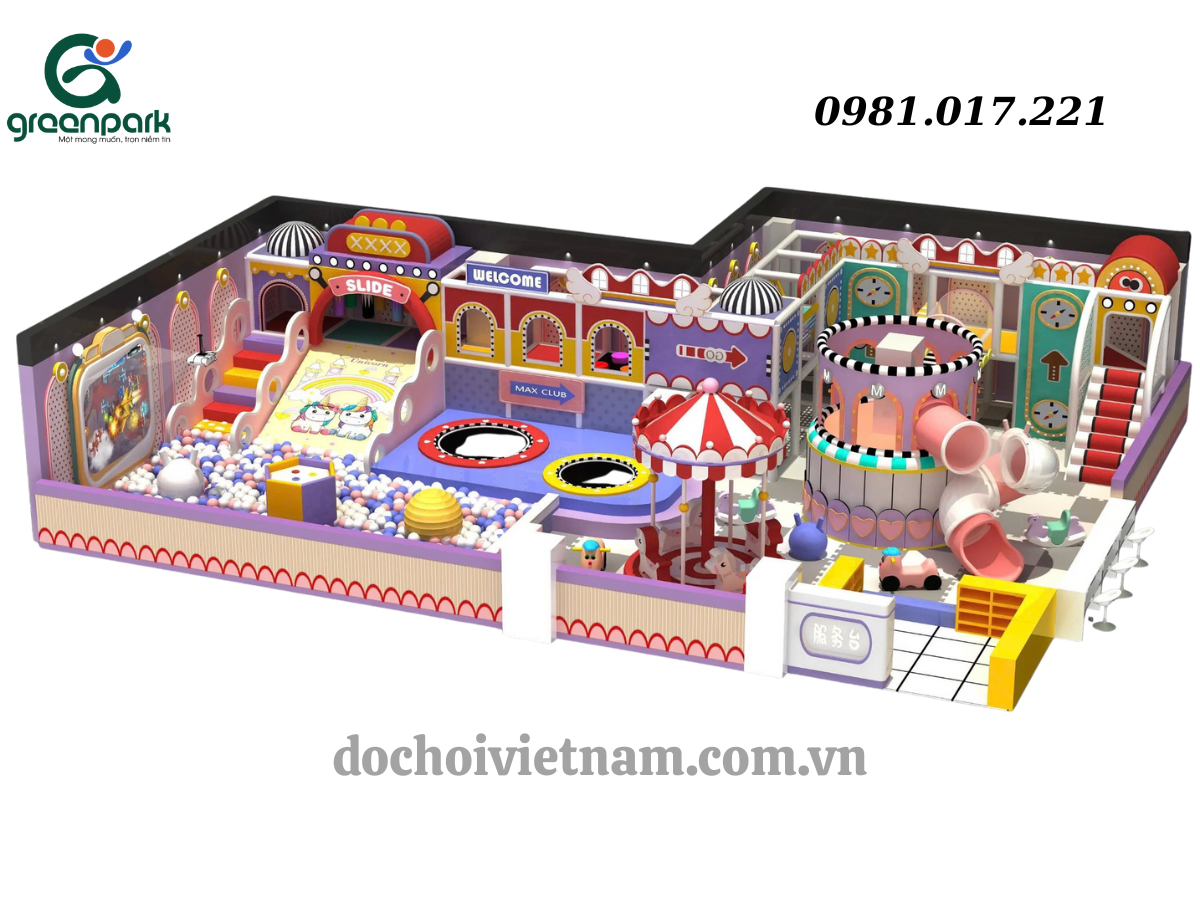 Khu vui chơi trẻ trong nhà GP01195 được thiết kế theo phong cách lễ hội – carnival kết hợp cổ tích hiện đại, tạo nên một không gian sinh động, cuốn hút và giàu trí tưởng tượng. Tổng thể bố cục hài hòa, không gian mở, các khu chức năng liên kết mạch lạc, vừa đảm bảo tính thẩm mỹ vừa tối ưu trải nghiệm vui chơi cho trẻ em trong nhà.