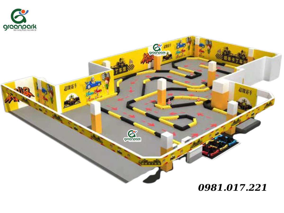 Mô hình đường đua Go Kart Mini GP05605 được thiết kế theo dạng đường đua uốn lượn phức hợp, bố trí trong không gian khép kín với hệ vách bao quanh toàn bộ khu chơi. Đây là dạng mô hình phù hợp cho khu vui chơi trong nhà có diện tích vừa, cần kiểm soát tốt luồng xe và đảm bảo an toàn cho trẻ nhỏ trong quá trình trải nghiệm.